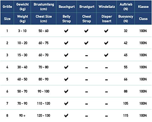 [Taille] Poids corporel de 3 à 10 kg – Tour de poitrine : 50 à 60 cm – L’indication du poids du corps se réfère principalement à la force flottante du gilet de sauvetage. Pour l’ajustement, il ne s’agit que d’une valeur indicative. Veuillez également vous référer aux indications du tour de poitrine. Si des vêtements supplémentaires sont portés sous le gilet ou si le poids du corps est indiqué dans la partie supérieure, vous devez donc choisir une taille au-dessus de la taille habituelle. Attention, ce gilet de 3 à 10 kg taille très petit.